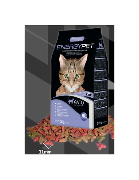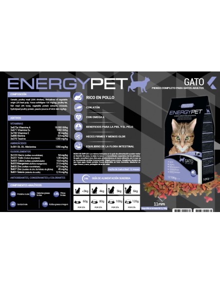 ENERGYPET es un pienso de gato rico en pollo (20%) y atún (4%).