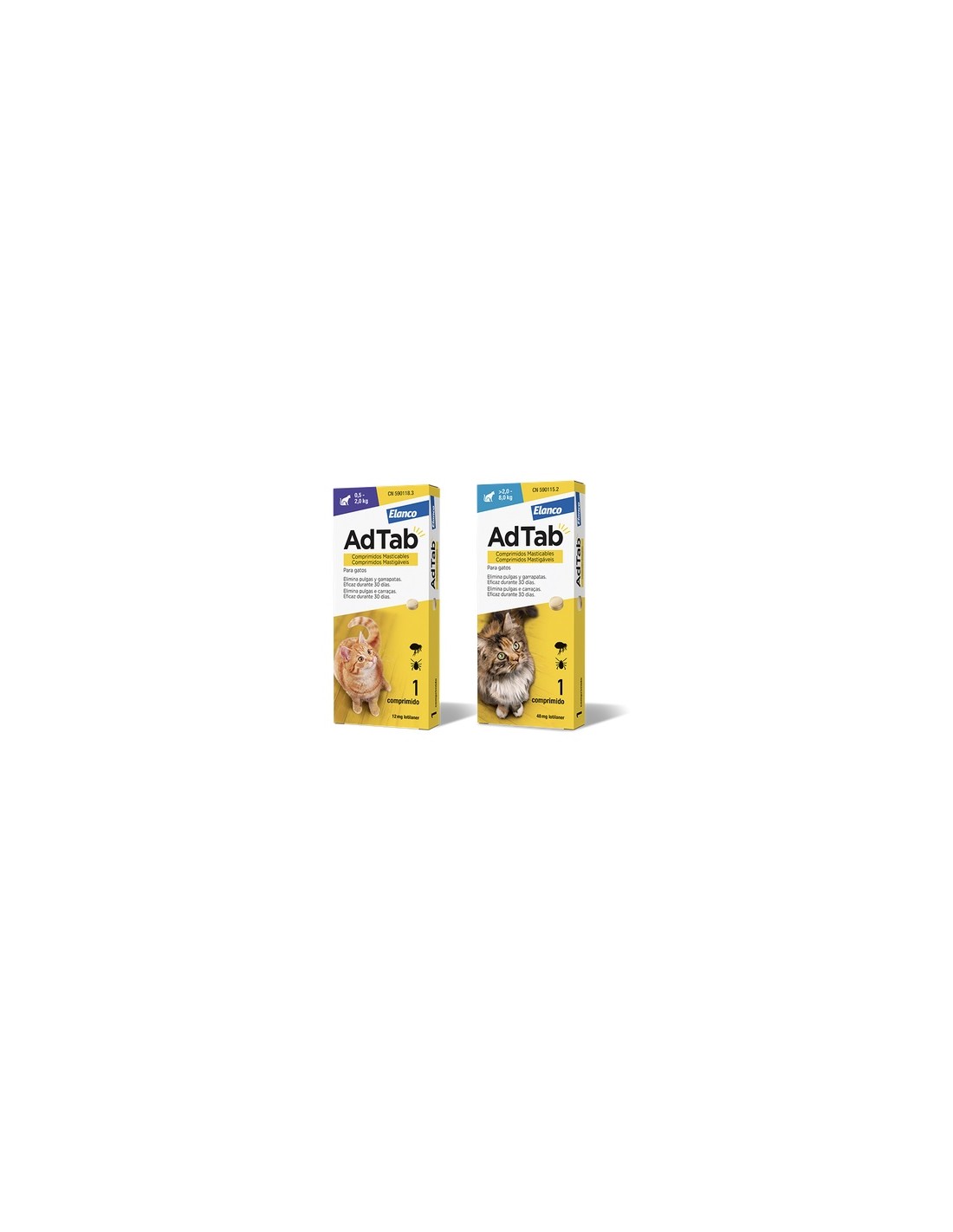AdTab es un medicamento que proporciona una acción inmediata y persistente durante un 1 mes de eliminación de pulgas (Ctenocephalides felis y C. canis) y garrapatas (Rhipicephalus sanguineus, Ixodes ricinus, I. hexagonus y Dermacentor reticulatus).